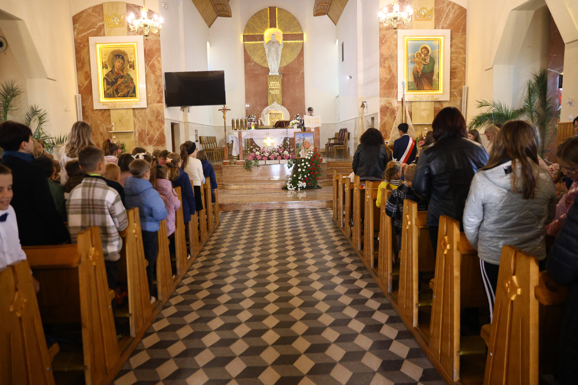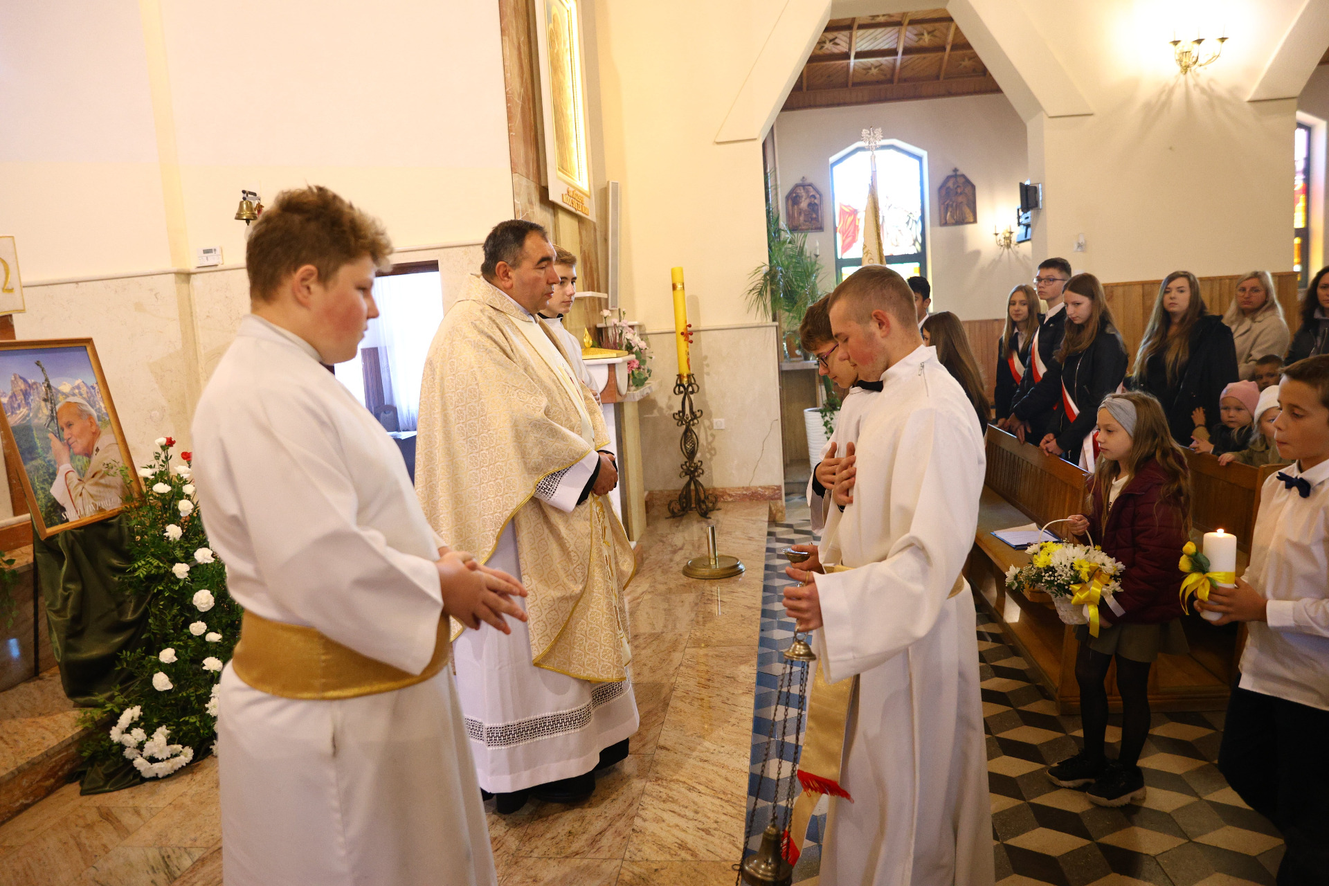 Każdy z was, młodzi przyjaciele, znajduje też w życiu jakieś swoje Westerplatte. Jakiś wymiar zadań, które musi podjąć i wypełnić. Jakąś słuszną sprawę, o którą nie można nie walczyć. Jakiś obowiązek, powinność, od której nie można się uchylić. Nie można zdezerterować... Jan Paweł II 16 października obchodzimy święto Patrona szkoły - Jana Pawła II - postaci wybranej przez społeczność lokalną, budowniczych szkoły. Imię szkoły zobowiązuje. Człowieka, który został świętym. Jan Paweł II daje nam drogowskazy do dobrego życia. Przesłanie jego nauczania i życia wydaje się być proste: kochać Boga, służyć ludziom, być dobrym, dostrzegać drugiego człowieka. Dziękuję księdzu Bartoszowi za Mszę świętą i Słowo Boże, pani Grażynie Łyko i młodzieży za przygotowanie liturgii oraz części artystycznej, panu Mateuszowi Szeliga za oprawę muzyczną, panu kościelnemu, mieszkańcom za obecność i wspólną modlitwę oraz śpiew; rodzicom za zadbanie o galowy ubiór dzieci. dyr. Anna Piędel Fot. Natalia Litha